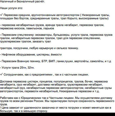 Работаем как с Юридическими так и Частными лицами. Мы осуществляем доставку грузов по всем регионам России. Мы гарантируем полную сохранность перевозимого груза.