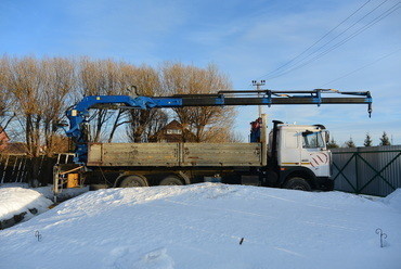 манипулятора на базе МАЗ 6303 11т. КМУ 7т Z-типа установлена на заднем свесе автомобиля .